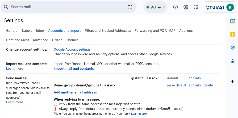 Pasul 2: Din meniu selectăm „Accounts and Import” și din secțiunea „Send mail as:” apăsăm pe „delete” din dreptul adresei de grup configurată.