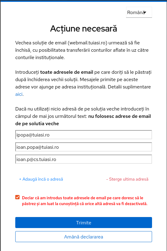 În formularul apărut la autentificarea în contul instituțional trebuie să introduceți toate adresele de email pe care doriți să le păstrați după închiderea vechii soluții. Mesajele trimise pe aceste adrese vor ajunge pe adresa instituțională.