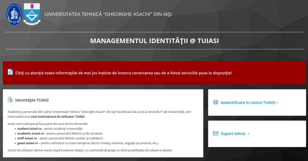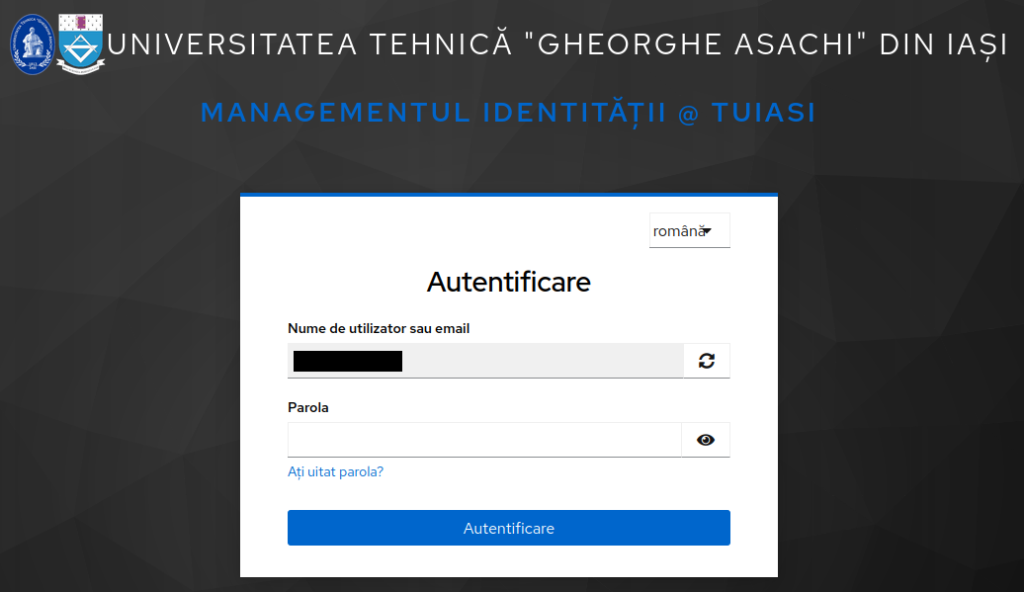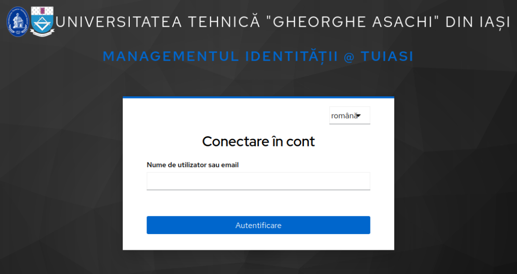 Pasul 1: Deschidem un browser și accesăm pagina de administrare a contului instituțional (https://sso.tuiasi.ro/). Facem click pe „Autentificare în contul TUIASI” pentru a deschide pagina de autentificare unde introducem adresa instituțională.