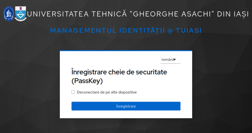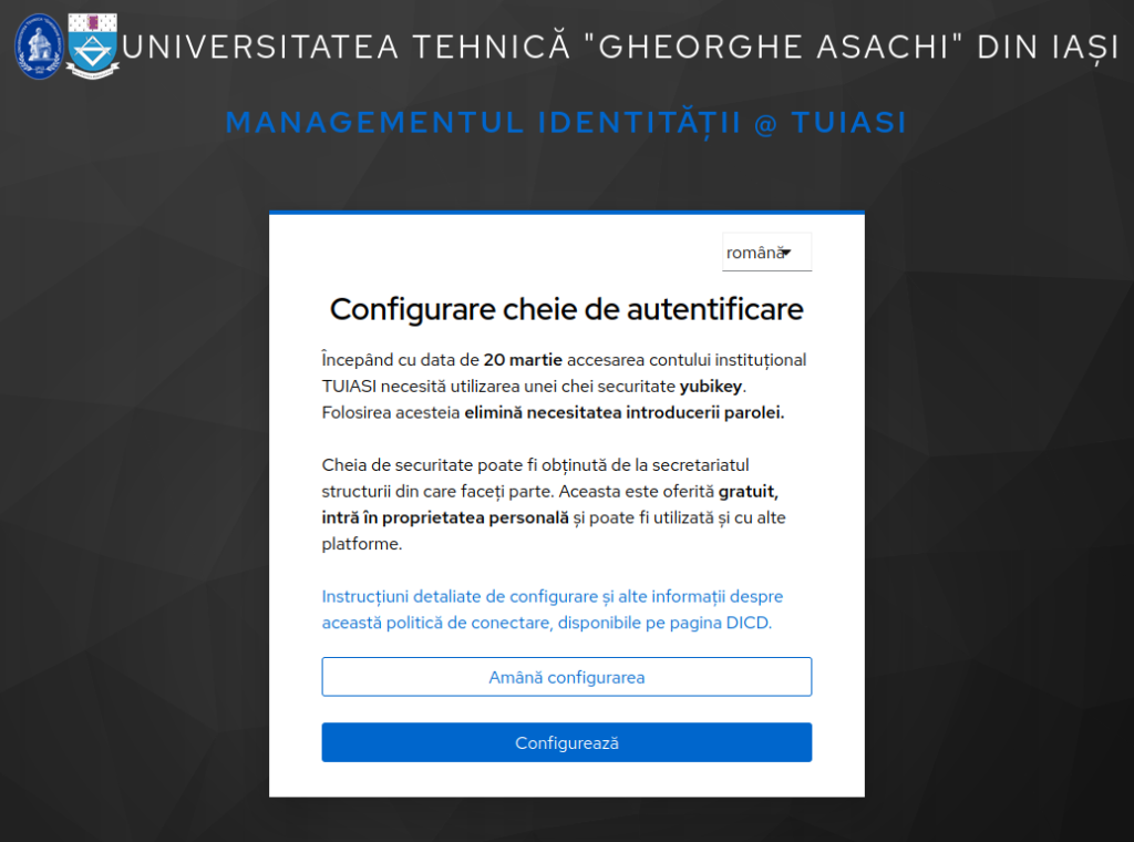 ⚠️ Fiecare angajat are atribuită o singură cheie de autentificare YubiKey. În cazul pierderii, deteriorării sau furtului, veți fi nevoiți să achiziționați, pe cont propriu, o nouă cheie YubiKey compatibilă pentru a vă restabili accesul la contul instituțional.