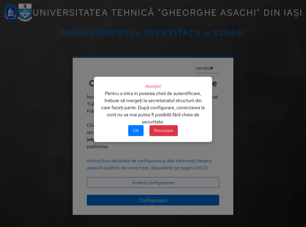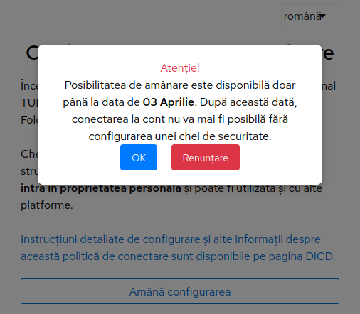 În cazul conturilor instituționale noi, configurarea cheii poate fi amânată pentru maximum 3 zile de la prima autentificare.