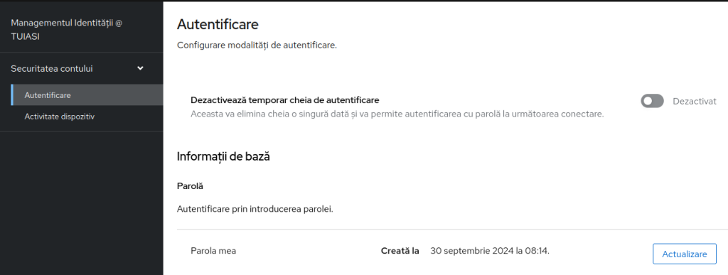 Pasul 1: Trebuie să vă conectați la platforma Managementul Identității @ TUIASIhttps://sso.tuiasi.ro -> „Autentificare în contul TUIASI”. După autentificarea cu ajutorul cheii de autentificare YubiKey la contul instituțional, veți fi redirecționați către o pagină cu detalii personale.
